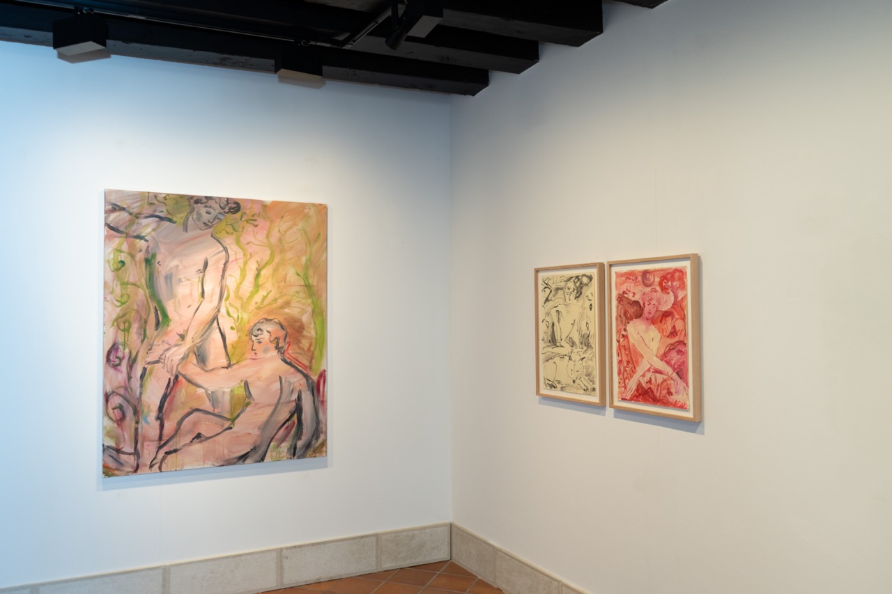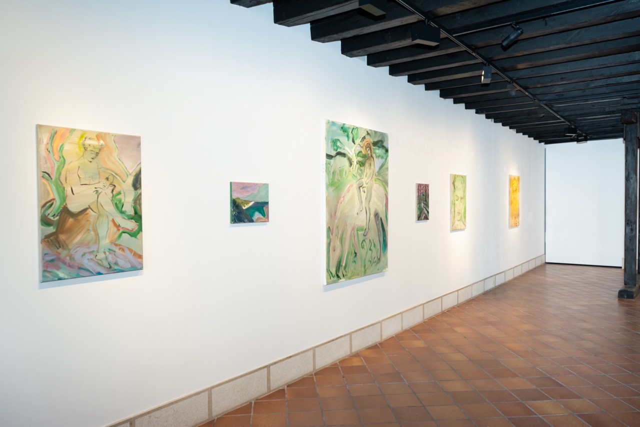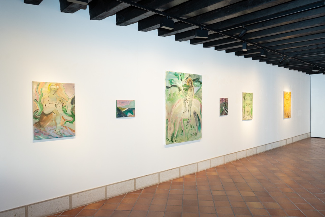 Luke Edward Hall’s solo exhibition at Patricia Low Contemporary, Venice, is set in ‘The Silver Vale’, a place where mythology and personal identity merge, where landscape and fantasy dissolve into one another. The exhibition presents new paintings created by Hall in his Oxfordshire studio over the past few months. The starting point for this new body of work is the large painting XXX made in September 2024—a vision of Pan, the Greek god of the wild, leading a figure into a glowing, dreamlike woodland. This moment of initiation, at once intimate and ecstatic, became the catalyst for a series of paintings and drawings that examine queer identity through the lens of mythology and nature.