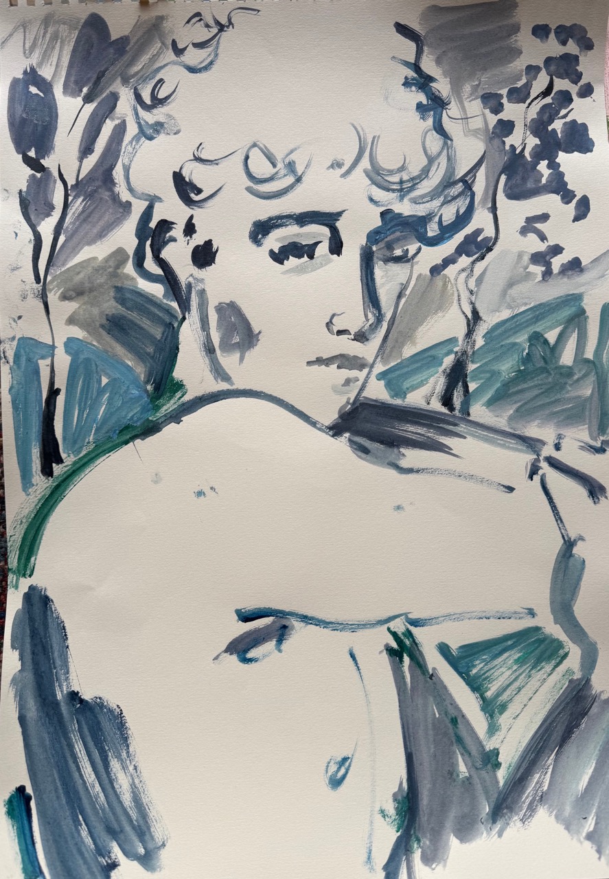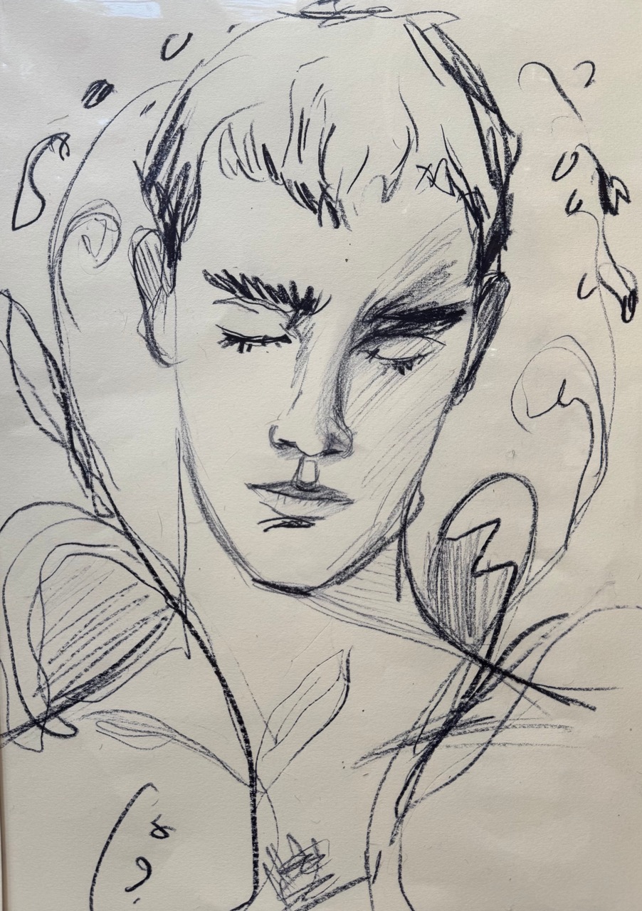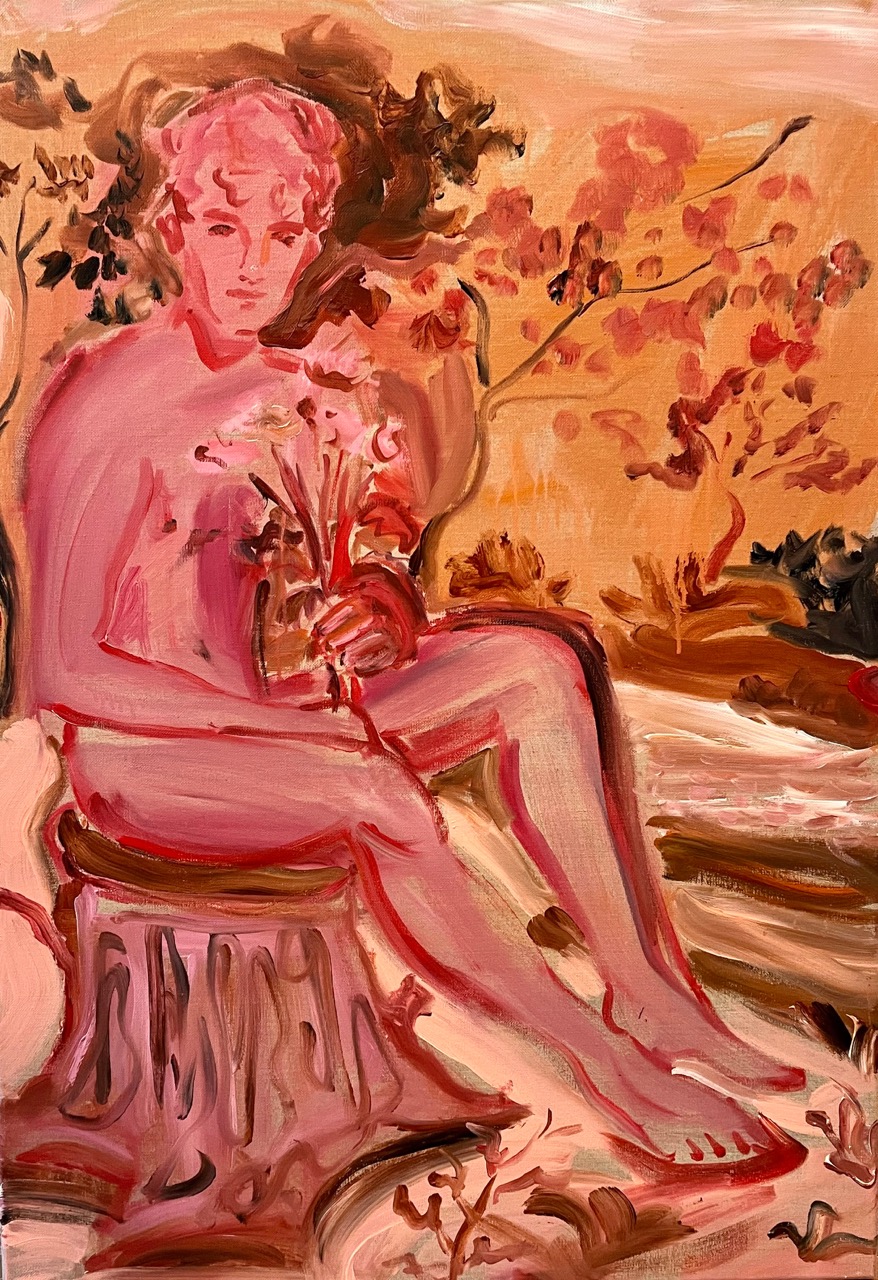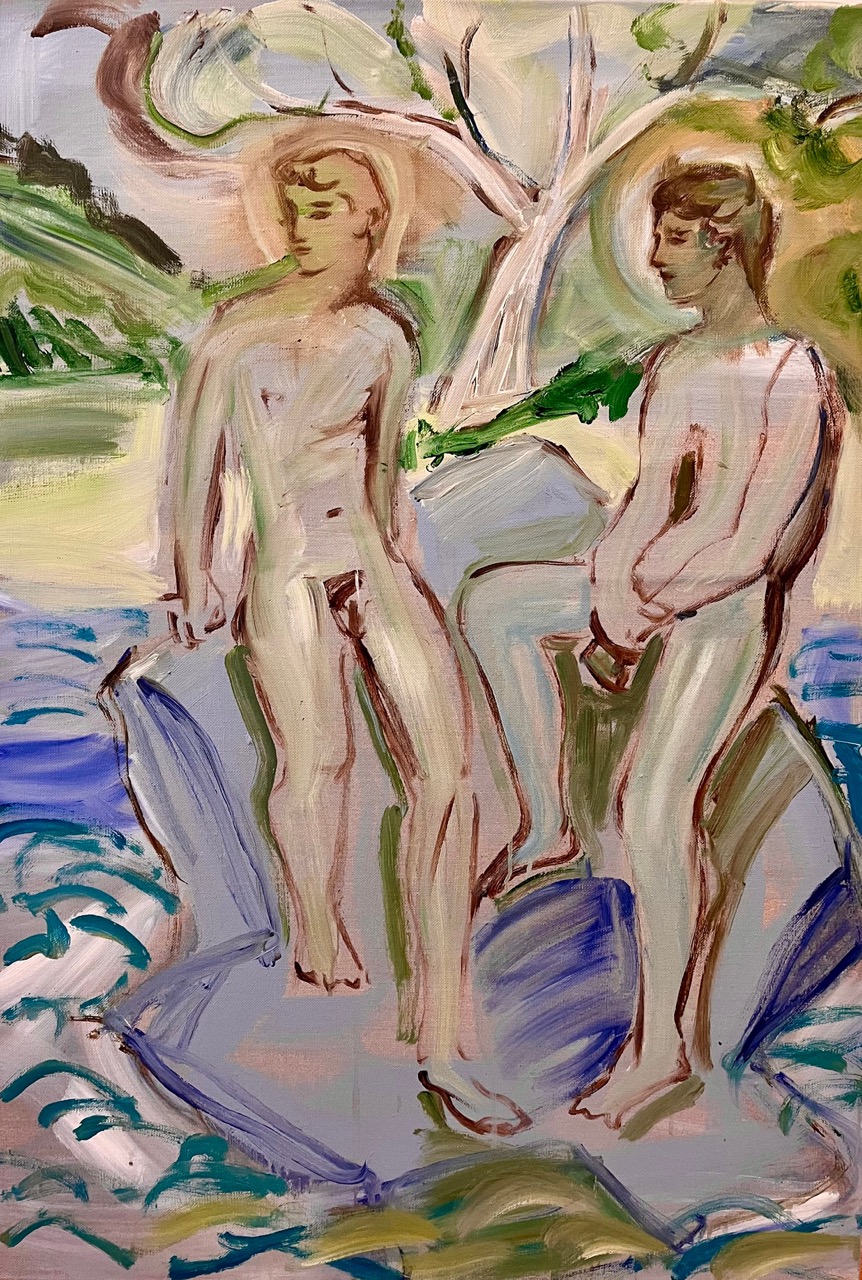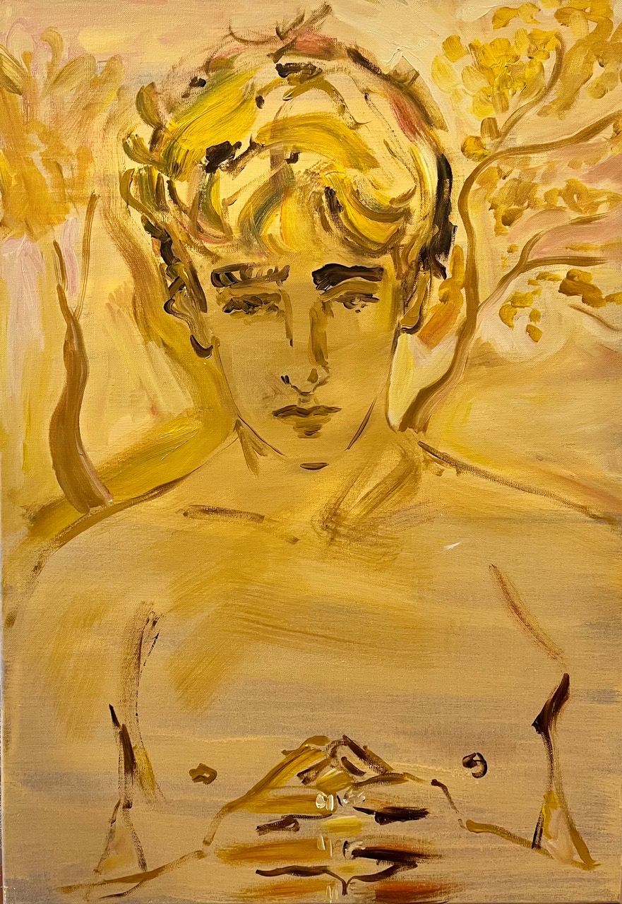 The landscapes Hall conjures—fields awash in gold, rivers of lilac, skies charged with impossible pinks—draw from real locations, particularly Devon and Cornwall, but are rendered through his own imagined, mythic lens. The Silver Vale, an invented setting within his works, is a site of queer refuge, where identity is unfixed, fluid, and free. This re-enchantment of landscape is central to Hall’s visual language, recalling a lineage of artists who have depicted the male figure through a poetic, queer gaze. His work exists in dialogue with Duncan Grant’s pastoral sensuality, the charged androgyny of Jean Cocteau’s drawings, and Andy Warhol’s dreamlike depictions of the male form. Like these artists before him, Hall conveys a world that is full of magical potential, a space where queer desire and mythology entwine.