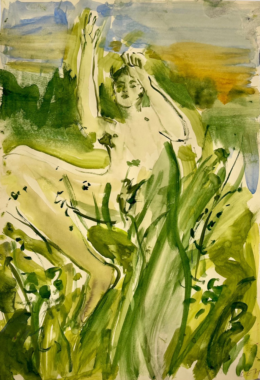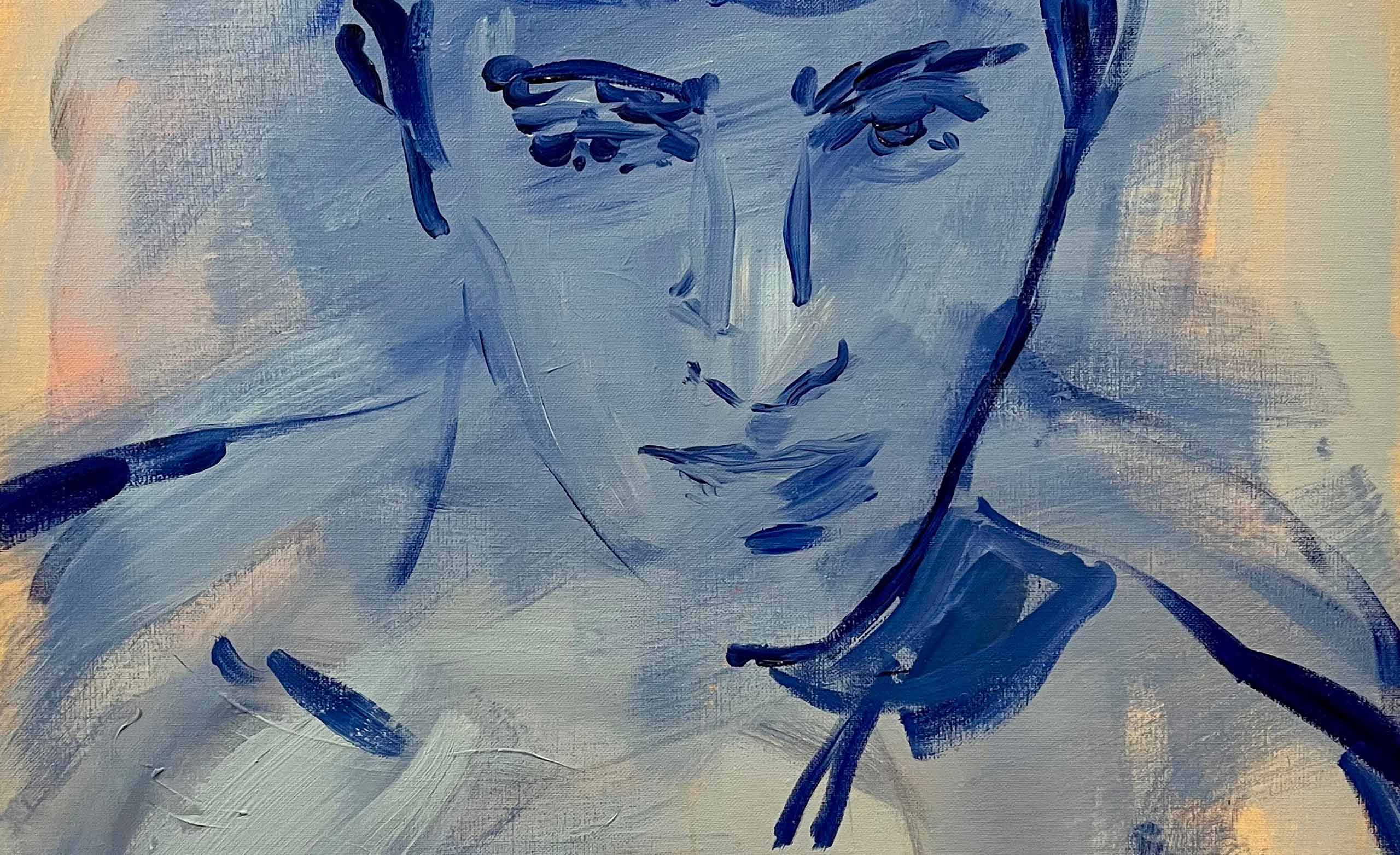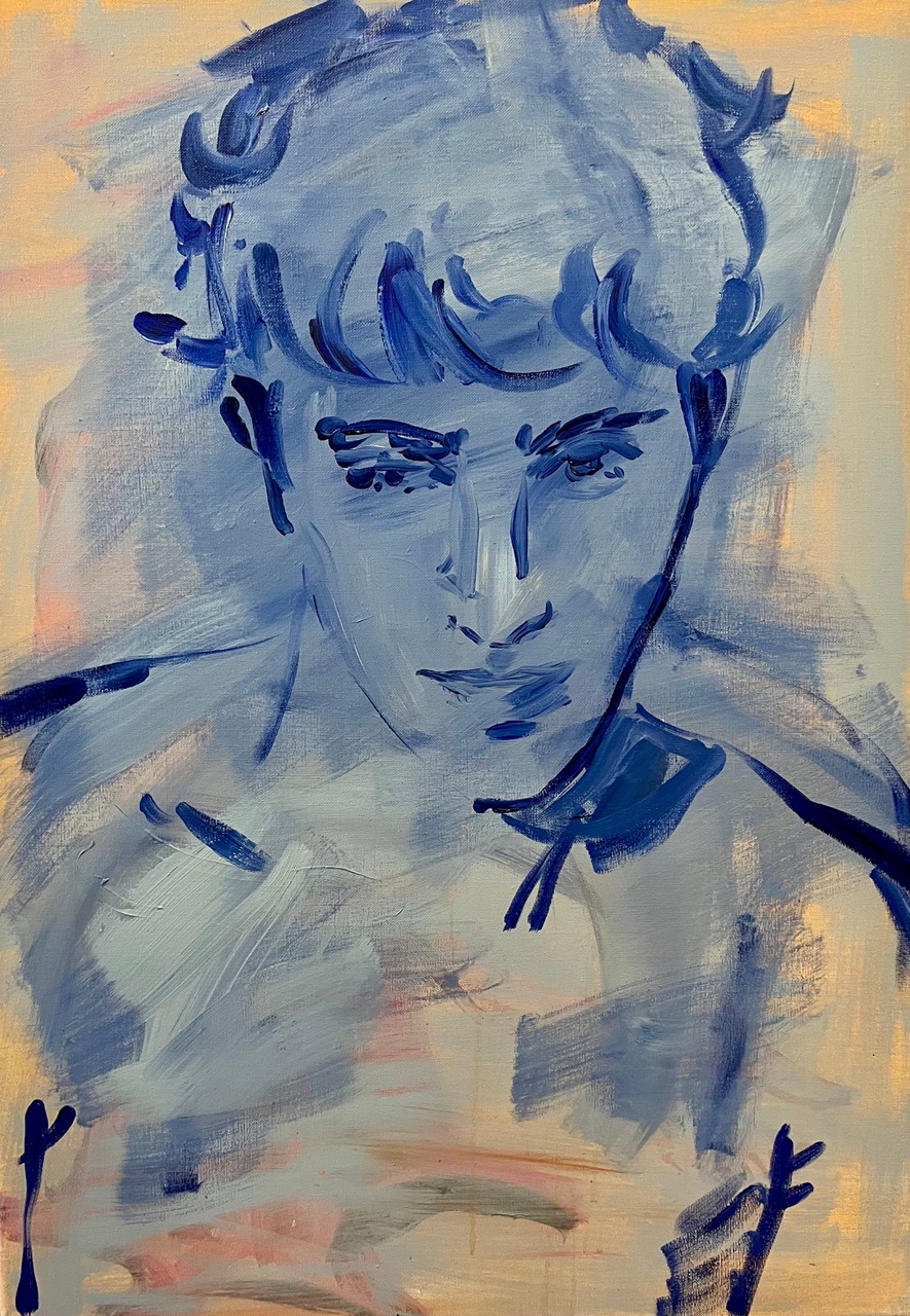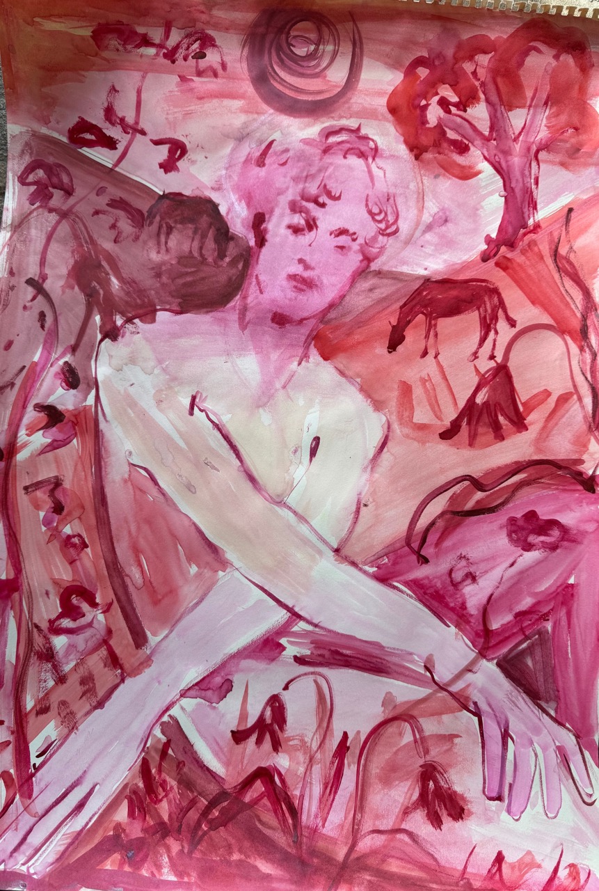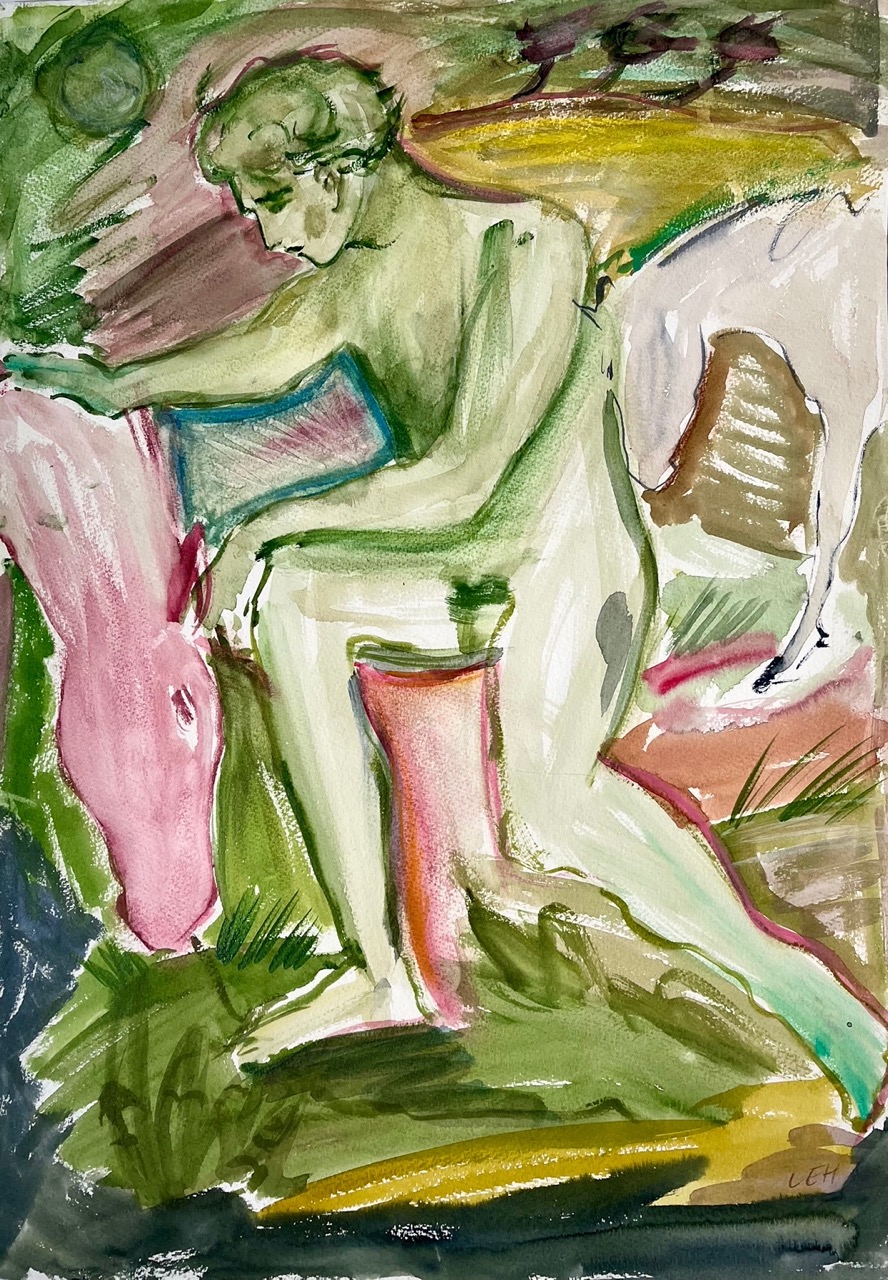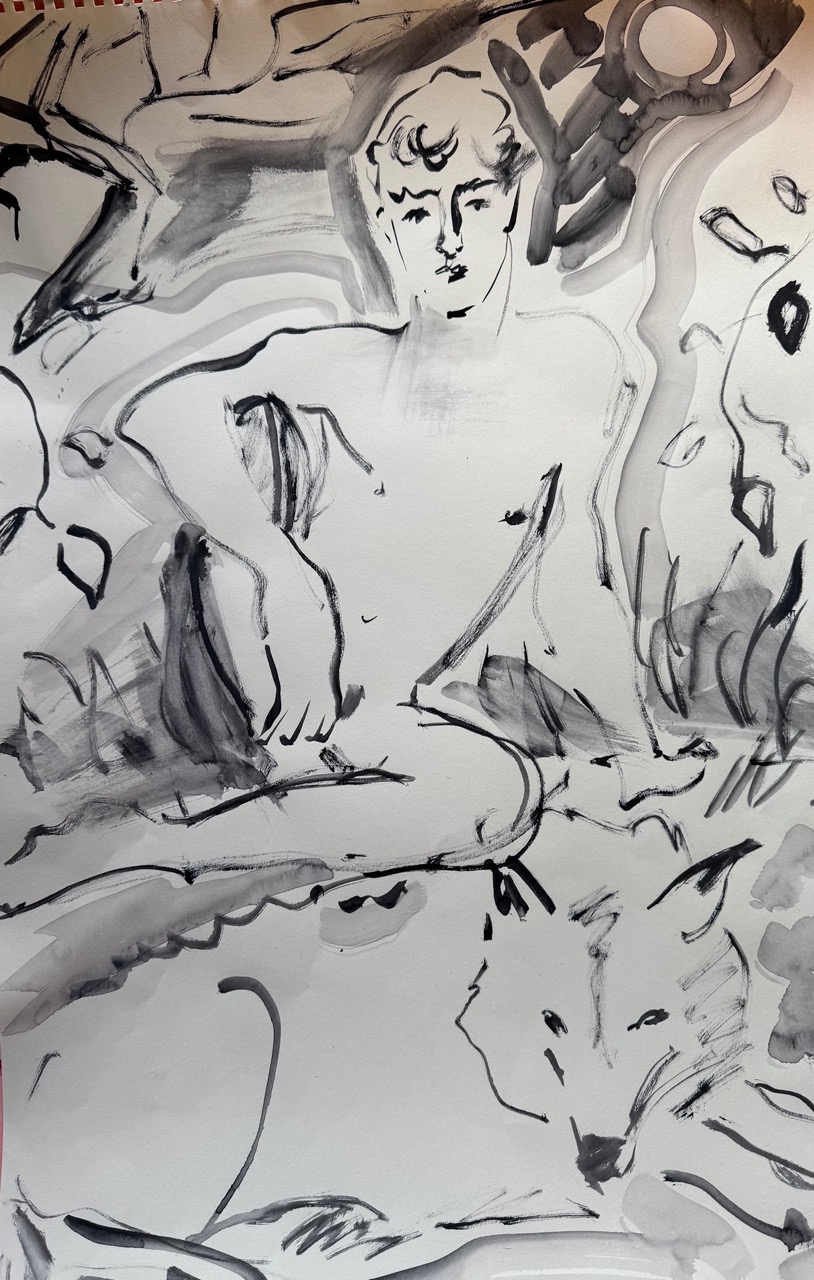 The landscapes Hall conjures—fields awash in gold, rivers of lilac, skies charged with impossible pinks—draw from real locations, particularly Devon and Cornwall, but are rendered through his own imagined, mythic lens. The Silver Vale, an invented setting within his works, is a site of queer refuge, where identity is unfixed, fluid, and free. This re-enchantment of landscape is central to Hall’s visual language, recalling a lineage of artists who have depicted the male figure through a poetic, queer gaze. His work exists in dialogue with Duncan Grant’s pastoral sensuality, the charged androgyny of Jean Cocteau’s drawings, and Andy Warhol’s dreamlike depictions of the male form. Like these artists before him, Hall conveys a world that is full of magical potential, a space where queer desire and mythology entwine.