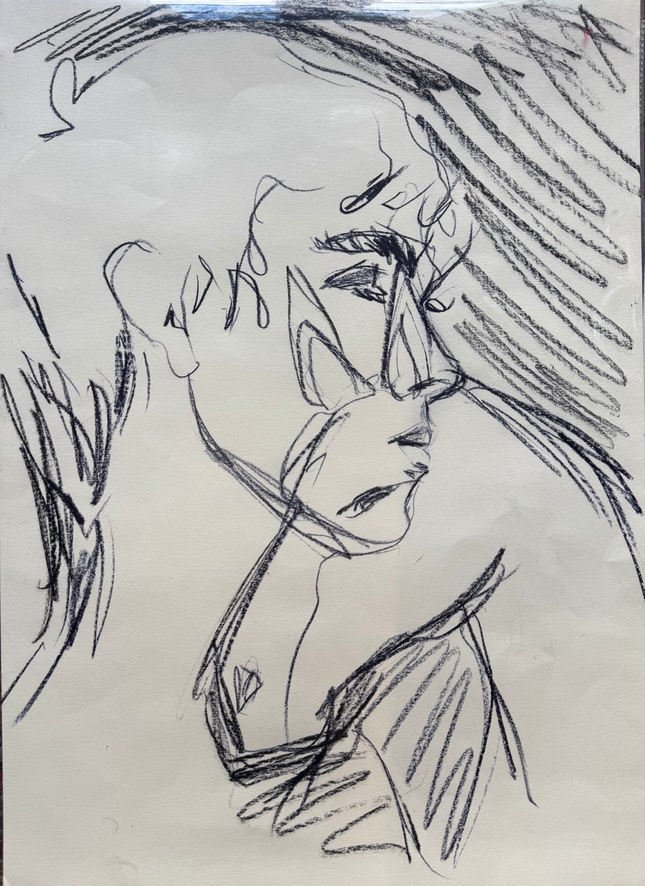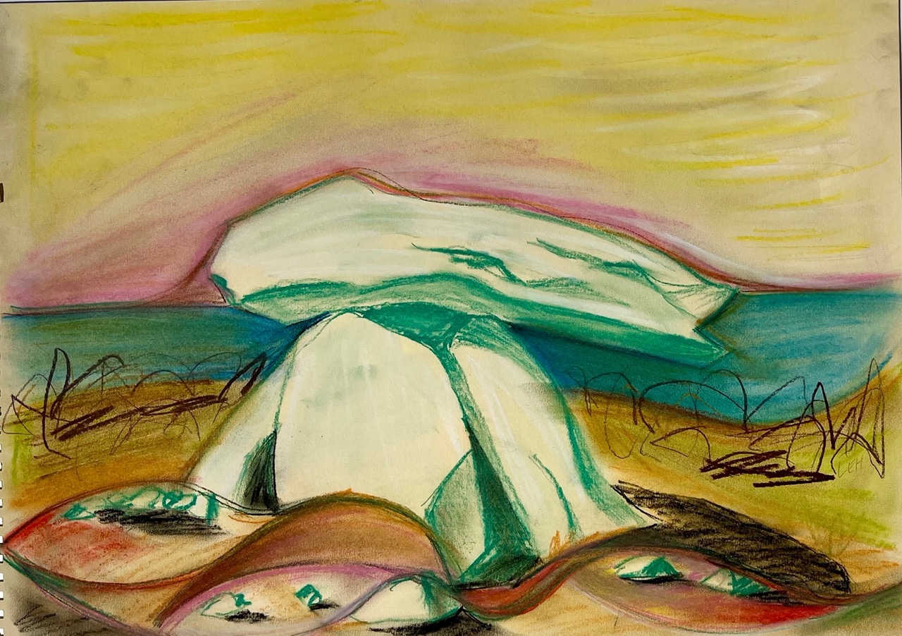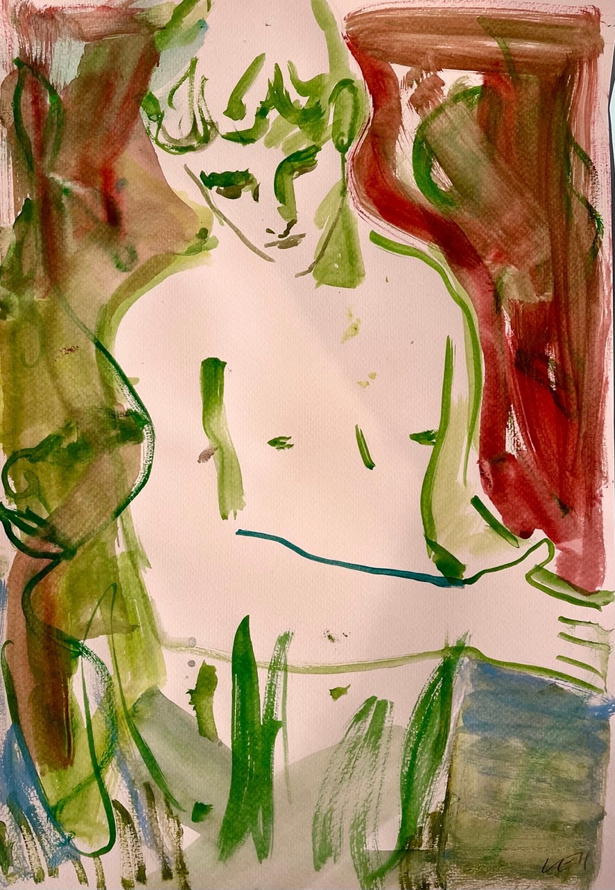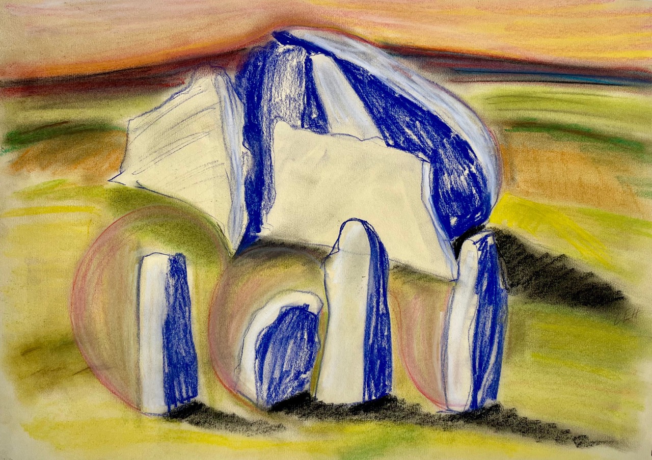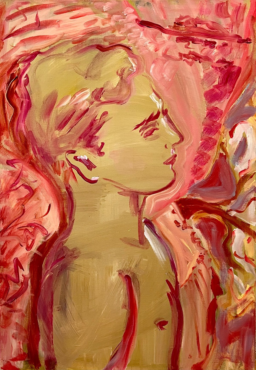 The landscapes Hall conjures—fields awash in gold, rivers of lilac, skies charged with impossible pinks—draw from real locations, particularly Devon and Cornwall, but are rendered through his own imagined, mythic lens. The Silver Vale, an invented setting within his works, is a site of queer refuge, where identity is unfixed, fluid, and free. This re-enchantment of landscape is central to Hall’s visual language, recalling a lineage of artists who have depicted the male figure through a poetic, queer gaze. His work exists in dialogue with Duncan Grant’s pastoral sensuality, the charged androgyny of Jean Cocteau’s drawings, and Andy Warhol’s dreamlike depictions of the male form. Like these artists before him, Hall conveys a world that is full of magical potential, a space where queer desire and mythology entwine.