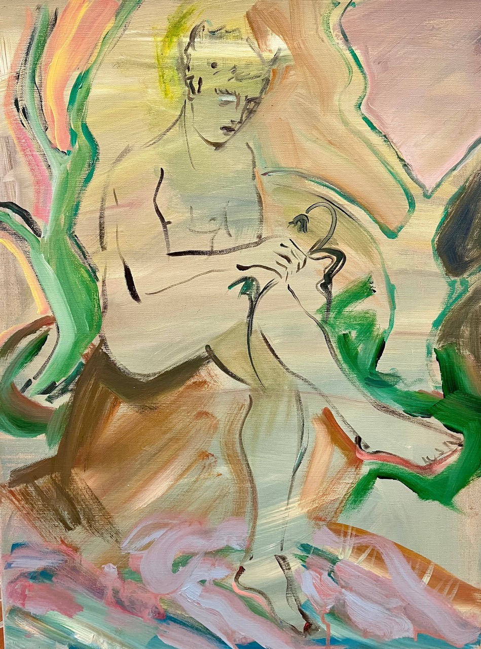 Hall’s paintings echo the themes of E.M. Forster’s 1912 short story The Story of a Panic, in which the god Pan appears to a young outcast named Eustace, transforming him irrevocably. Forster’s tale has been interpreted as an allegory for queer revelation, a reading that resonates deeply with Hall. Pan, in his works, is both a seducer and a liberator, leading figures away from the constraints of the ordinary world and into a heightened, transcendent existence. But perhaps Pan is not external at all—perhaps he represents something internal, something required to embrace the self fully and without hesitation. In the artist’s words, Pan “represents the courage needed to live a life separate, apart, wonderful.