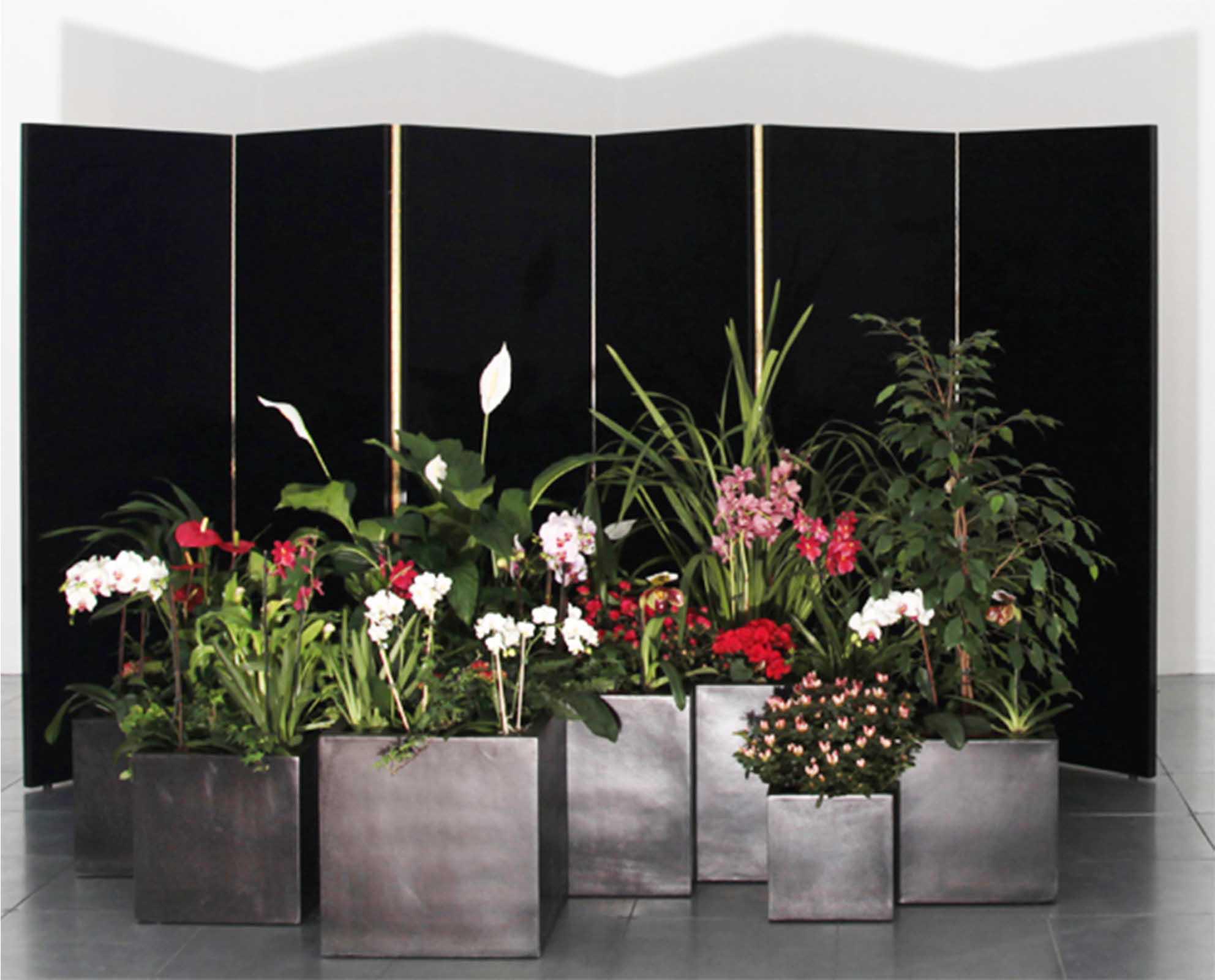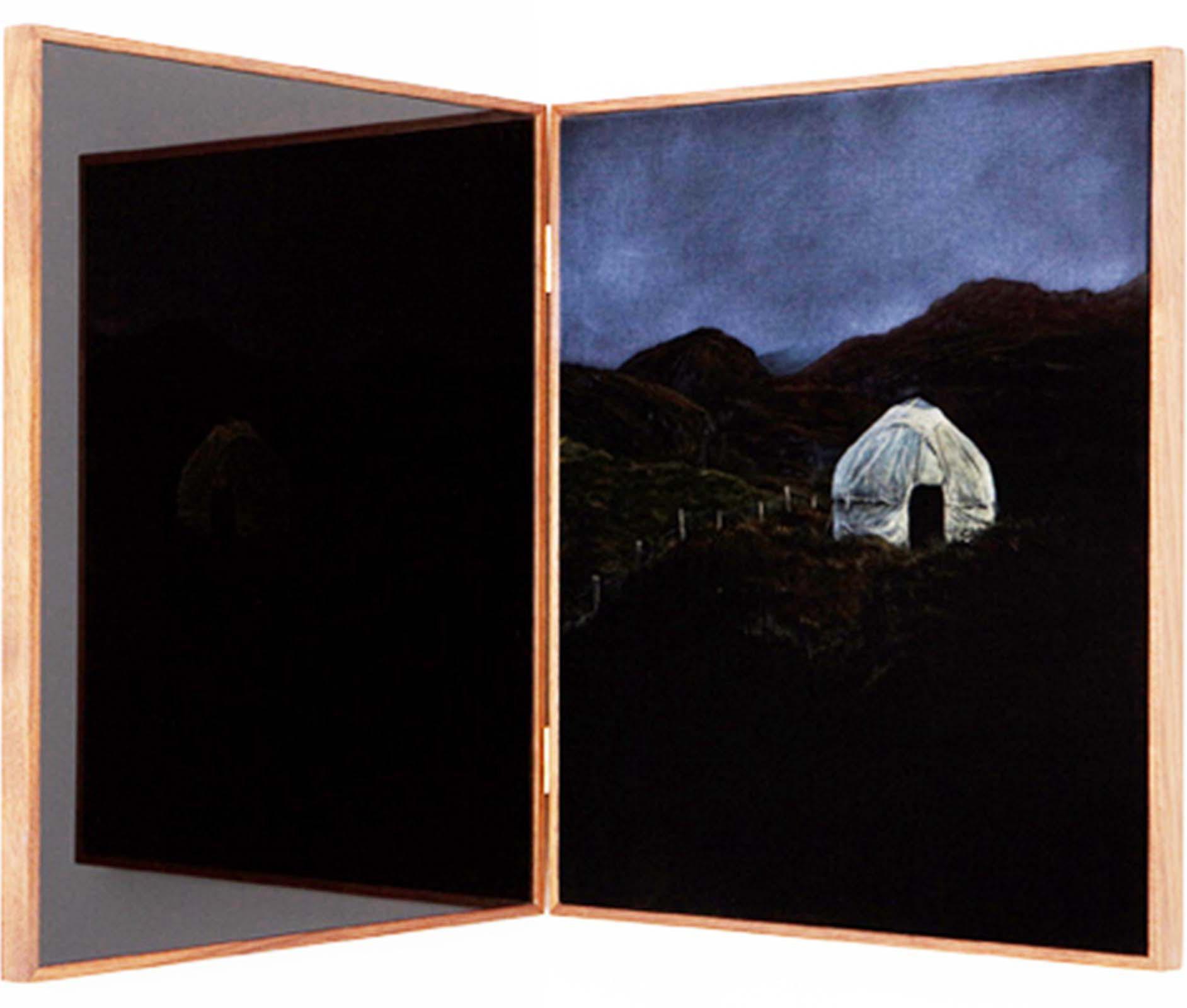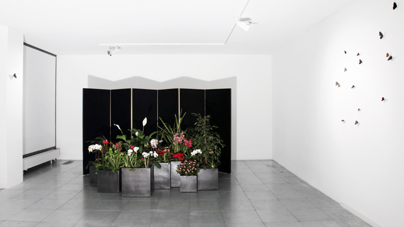 the fixating spell of Hosking’s modern day muse becomes simultaneously heighted and belied by evidence of her exotic actuality. These ideas of seduction and illusion are continued in Eros and Agape, a large scale installation comprised of potted wild flowers and a six panel articulated velvet screen designed in the tradition of Japanese Byobu. Intensely spotlit, the shadow of the flowers projected onto the screen takes on the characteristics of an expansive landscape, a poignant articulation of beauty exceeded by its simulated merging of opposite psychological tendencies