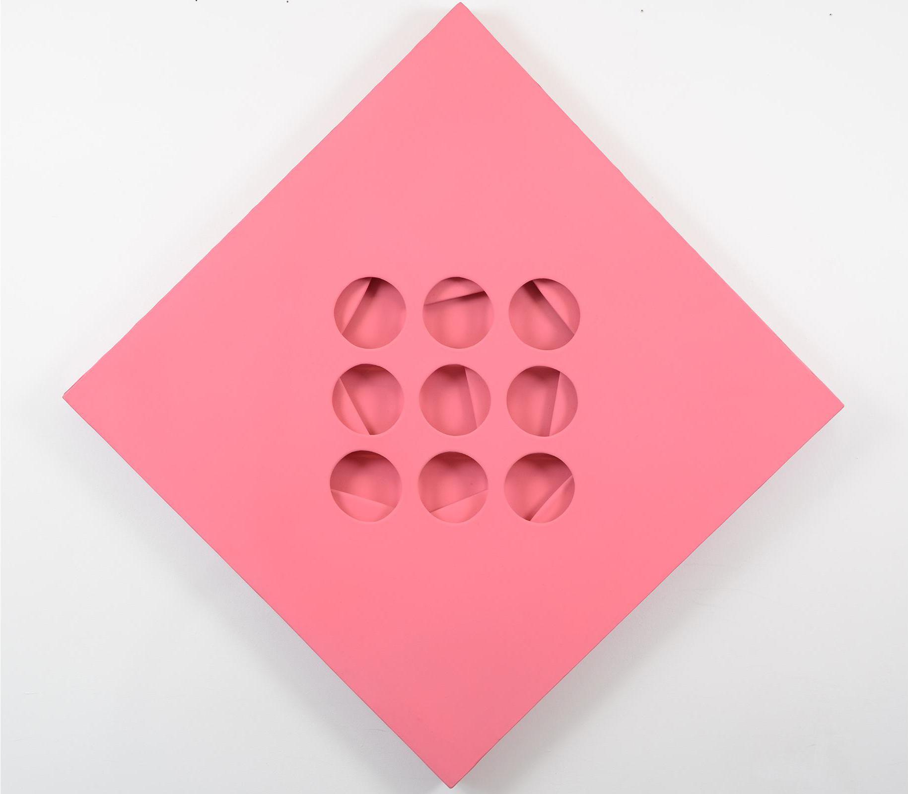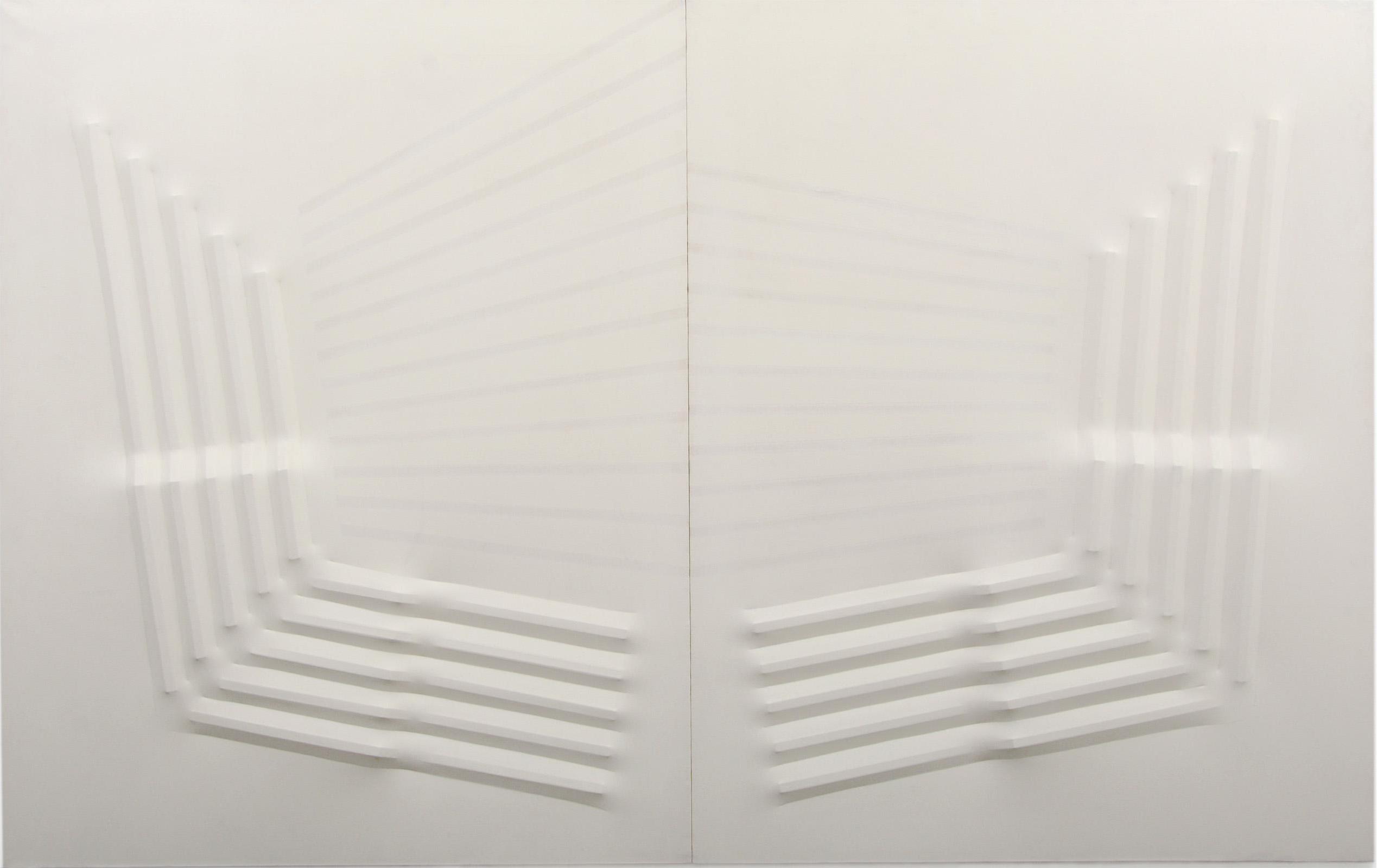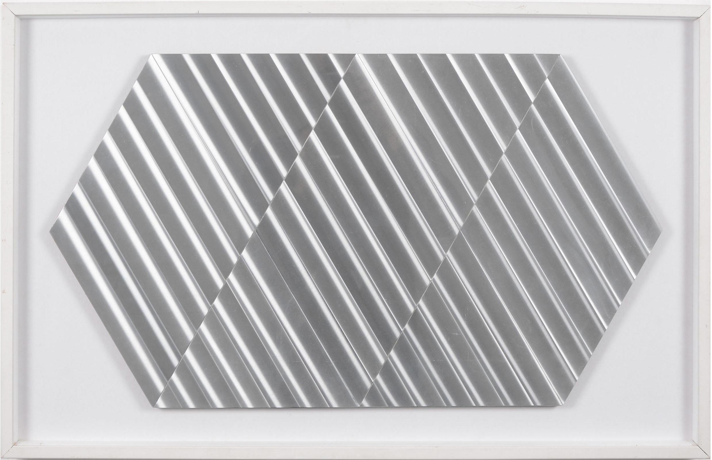 Rethinking materiality was one concern of the Italian Avant-garde additionally a group of artists around Lucio Fontana explored questions of space, matter and energy. Their monochrome works often invite the viewers to plunge into the infinite spaces. However, rather than celebrating a blind faith in progress, the most successful exploration of movement in real time and space in the visual art of the 1960s was to emphasize the precarious balance between construction and deconstruction, appearance and disappearance. Already in 1946 Lucio Fontana (* 1899 Rosario, Argentina; † 1968 Comabbio) initiated the “Manifiesto blanco” asking to turn away from conventional materials and proclaiming a synthesis of painting, sculpture, music and poetry. He aimed to liberate the artwork of any pictorial and propagandistic rhetoric only existing in the viewers imagination. From 1958 onward he realized his “Tagli” works with slashes in the painting’s surface backed by Gaze to increase the spatial effect destroying the image medium and thereby the basic conditions of painting. His “Concetti spaziali (Spatial concepts) tried to achieve the expression of an forth dimension became a ground-breaking new aesthetic idiom.  Following his mentor Fontana Agostino Bonalumi (* 1935, Vimercate;  †  2013, Milan) developed the idea of “pittura-ogetto” (painting objects) going beyond the idea of canvas. He participated in the Azimuth magazine and exhibition at Azimut gallery founded by Castellani and Manzoni, later on in the international ZERO movement. In 1966 when he was invited to 33rd Venice Biennale for the first time, his works where shown in the same room as the ones by Paolo Scheggi. Paolo Scheggi’s (* 1940, Florence; † 1971, Rome) approach has been from the beginning of strong multidisciplinary character and ranging from visual arts to architecture to fashion, from poetry to urban and theoretical performances reflected always conceptual and metaphysical questions. He was founder of the art and literature magazine il malinteso and editor of Marcatré. Moving to Milan in 1961 he became part of the Milanese Avantgarde and joined the group around Azumith as well as international movements such as nove tendencije, Zero and Nul. Among others he became friends with Eduarda Emilia Maino, known as Dadamaino (* 1930, Milan; † 2004, Milan), who is considered to be one of Italy’s most progressive female artists. She was included twice in the Venice Biennale. After completing a medical degree the self-taught artist frequented by the end of the 1950s the group around Lucio Fontana getting in touch with his spatial concepts. Later she joined the Azimuth group, Zero, Nul and nove tendencije. From 1958 onward she received much attention of her work series what she called “Volumes” that feature large punctured holes. In the 1970s she explored Op-Art in a series of optical-psychedelical paintings fascinated by the idea of movement. In his works often made out of steel and aluminium the artist Getulio Alviani (* 1939, Udine) pioneered the Op-Art movement in Italy confronting the viewer with questions on reason, relativity, motion and perception. With his polished aluminium surfaces – “Superfici a testura vibratile” (vibrating texture surfaces) – he won international acclaim. He was also part of the exhibition nove tendencije in Zagreb and exchanged ideas with artists of the so-called G.R.A.V. (Groupe de Recherche d’Art Visuelle) in Paris who explored opportunities of dynamic art. In 1964 he successfully shared a room with Enrico Castellani at the Venice Biennale and was invited in 1968 to Kassel’s Documenta 4. Furthermore he took part in the prestigious show “The Responsive Eye” at MoMA in New York.