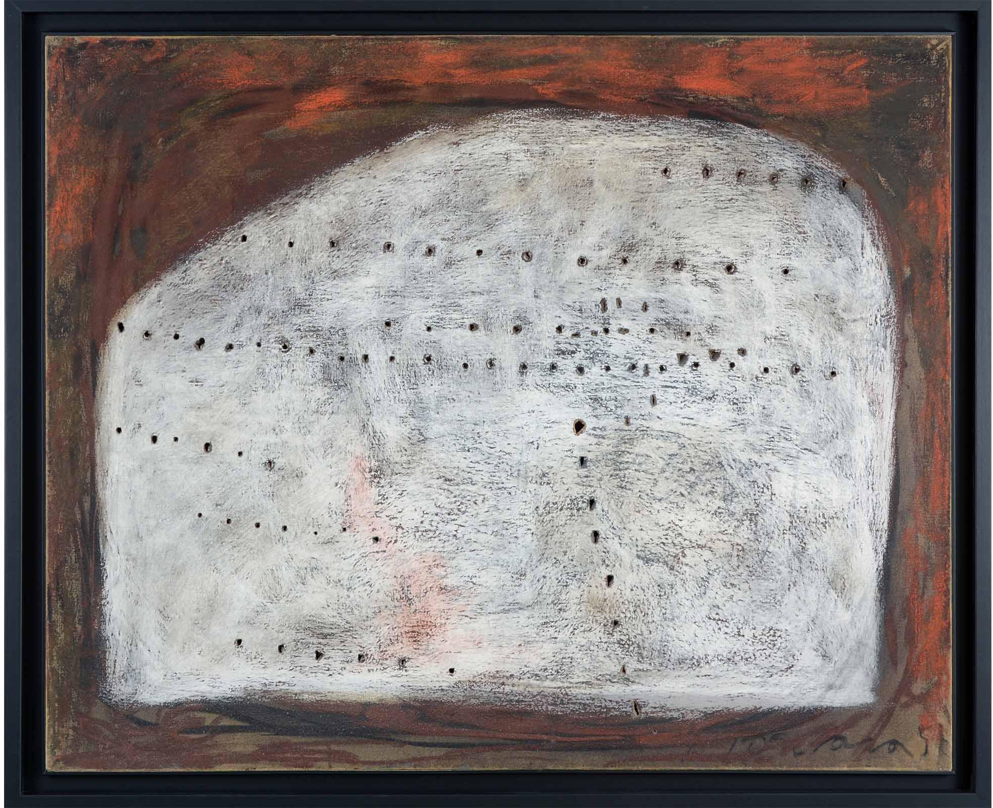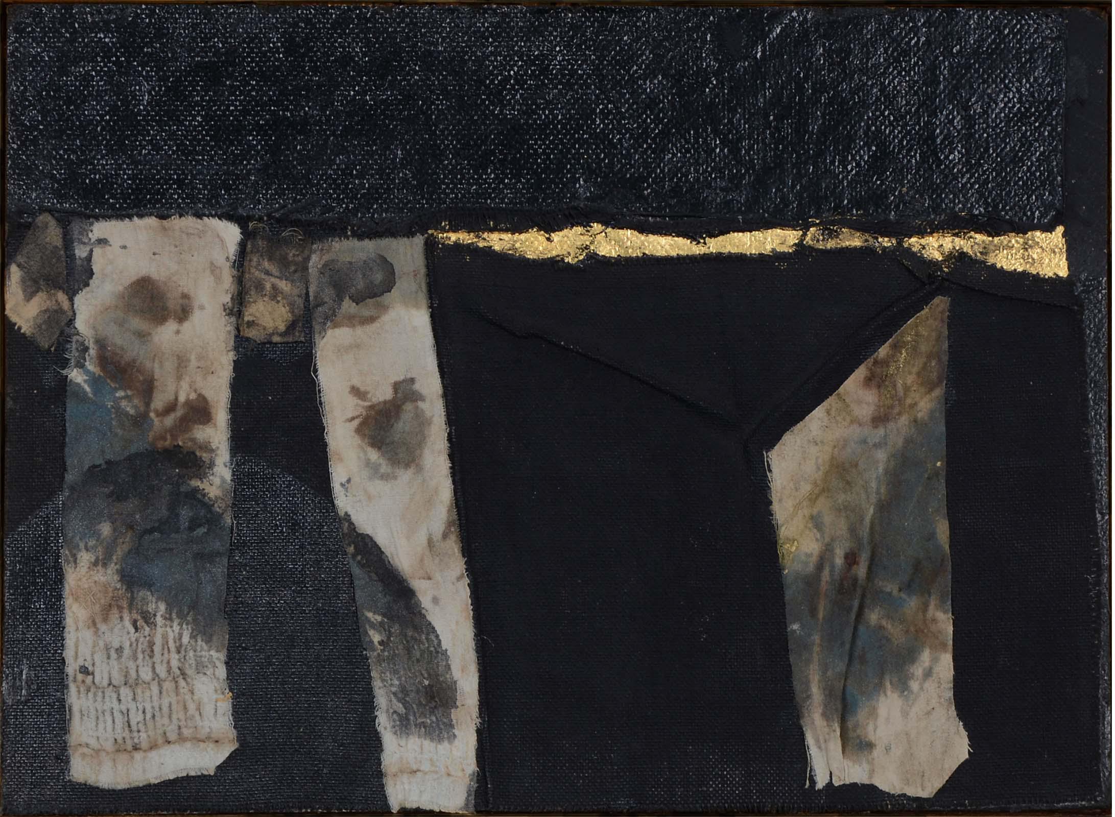 Exchange and travel were at the core of this moment in history. Many American artists such as Kooning, Rauschenberg, Rothko and Twombly spent time in Rome, the place where Alberto Burri (* 1915 Cittá di Castello; † 1995 Nice, France) lived for a long period in his live and emerged as one of the post-war Italian pioneers. Earning a medical degree he was sent to Libya as a medic, when Italy entered World War II. In 1943 after the Axis forces were defeated at El Alamein, his unit was captured in Tunesia and he was interned in a prison camp in Texas where he began to paint. Burri garnered attention investigating in the use of non-traditional materials such as burlap, wood, tar, plastic, zinc oxide, kaolin, PVC adhesives, cellotex and fabric. He experimented with cutting, tearing, and stitching as well as burning or torching the surface of different materials. The surface of the so-called Sacchi were assumed as wounds, cuts and torns, reflecting disorder and post-war trauma, simultaneously, this metaphor of the skin went through a process of scarring and healing.